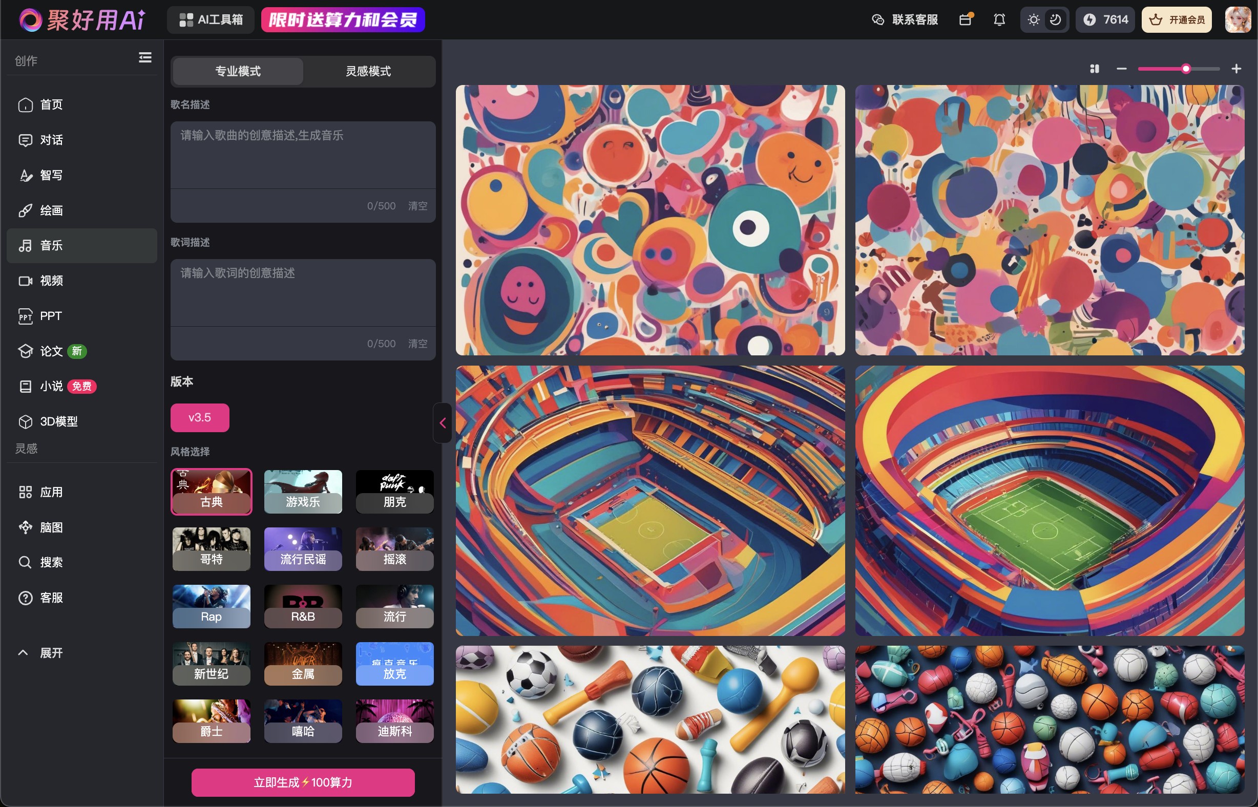 AI音乐生成 支持专业模式自定义歌词和风格创作音乐,无论您是专业音乐制作人还是初学者 ,AI都可以帮助您将灵感转化为完美的作品。